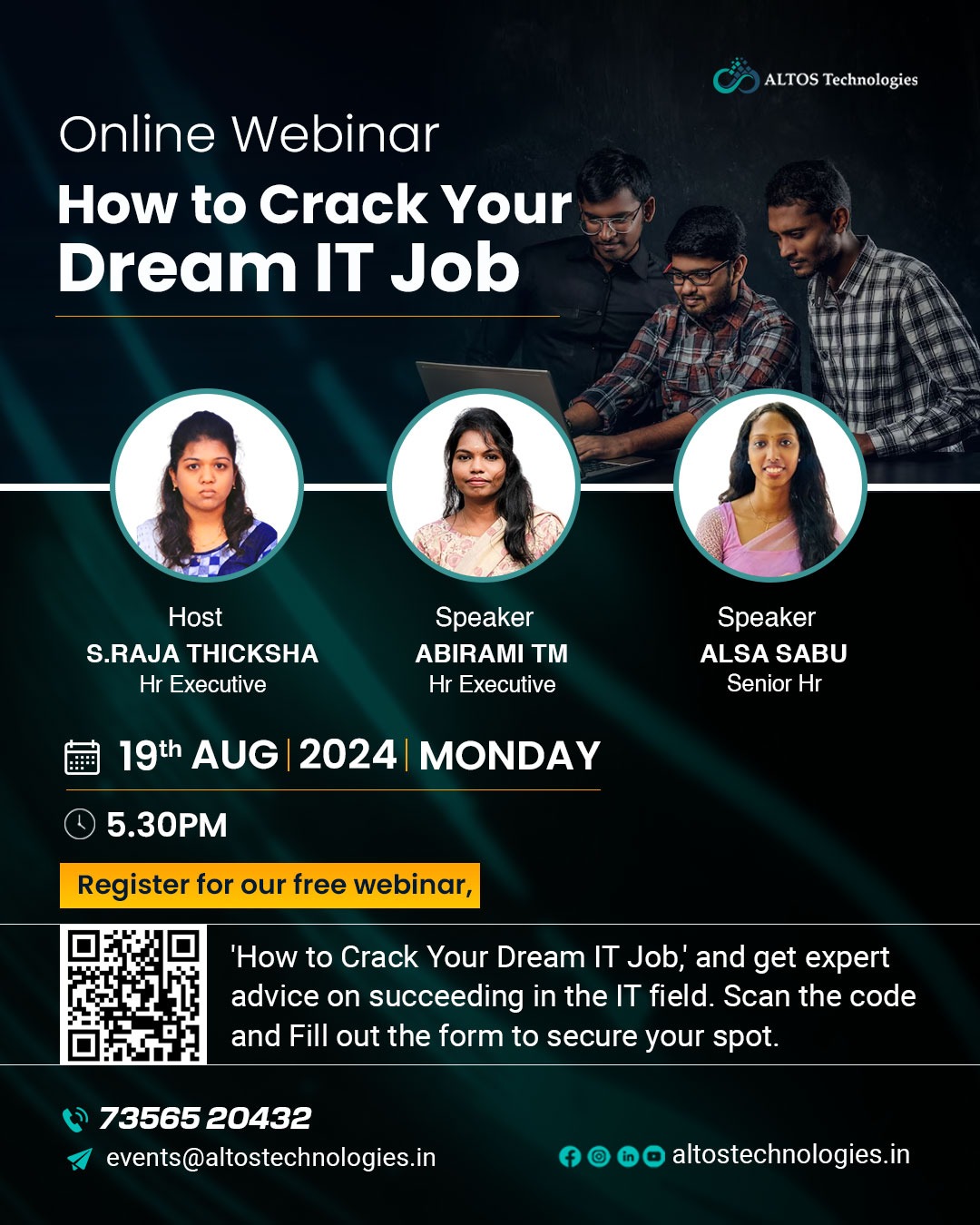 Altos Technologies, a leading software development company with offices in Kochi and Chennai. is hosting a free webinar, "How to Crack Your Dream IT Job," to help students and graduates. WE WILL COVER HOW TO : Strengthen resumes Address career gaps Prepare for IT interviews